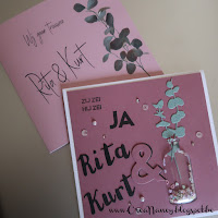 Een mooie kaart voor het stel met een tak eucalyptus in het flesje, heel leuk bedacht.